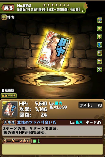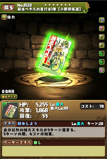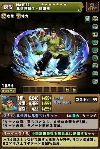 【進化前】 ・攻撃16倍+ダメージ65%減+4C加算LS ・超コンボ強化2個で火力を発揮可能 ・木列消し火力を底上げできる ・4Tの生成+サポートの進化スキルが優秀【進化後】 ・攻撃22倍+半減+軽減+固定1LS ・無効貫通時に高火力を発揮できる ・4Tの生成+サポートの進化スキルが優秀【アシスト進化】 |