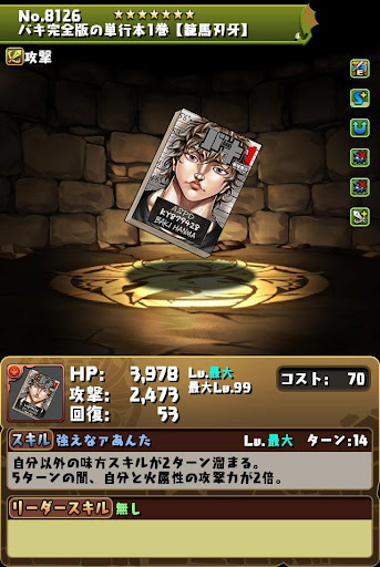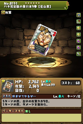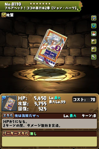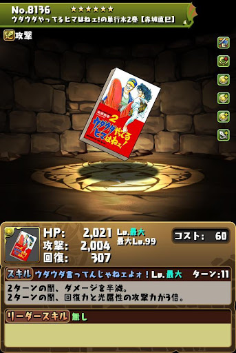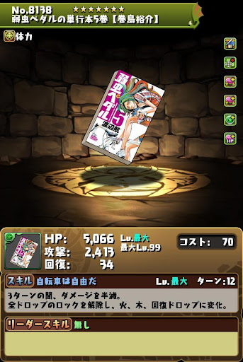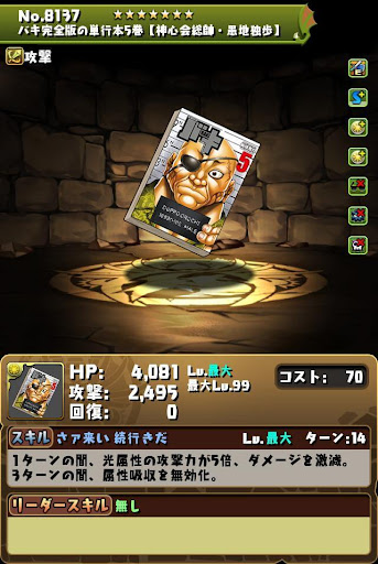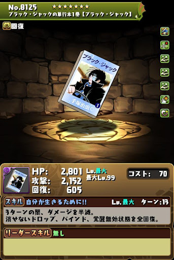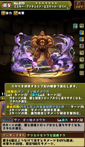 【進化前】 ・HP2倍+半減+攻撃16倍+4コンボ加算LS └半減条件ははHP80%以上時 ・3ターン持続の半減+属性吸収無効スキル持ち ・チームHP強化4個+スキブ4個も魅力【究極進化】 ・全パラ2.8倍+2秒延長+攻撃20倍+300万LS ・2種キラー2個+コンボ強化2個で火力発揮 └超覚醒でさらに超コンボ強化を付与できる ・3ターン持続の半減+属性吸収無効スキル持ち ・超覚醒でギミック対策も可能【アシスト進化】 |