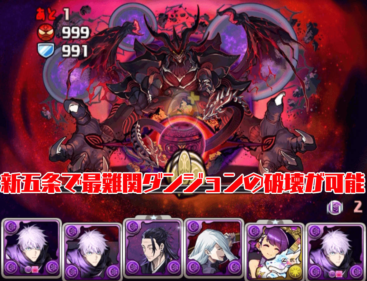 パズドラにおける最高難度ダンジョンである新凶兆チャレンジは、ルーレットや操作時間減少が高頻度で出現し新五条や宿儺が適性キャラである。新五条は、確定ガチャで入手できる1体に加えて2体はガチャから引く必要があるため、現環境最強キャラが欲しい方は魔法石を惜しまずに使おう。