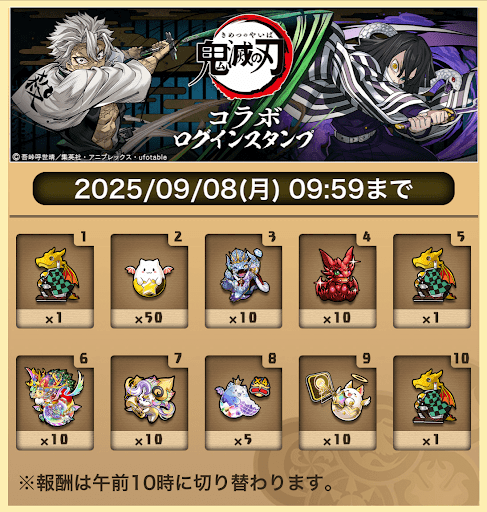 期間中はコラボ仕様のログインスタンプも登場する。ログイン日数に応じてコラボガチャを含む豪華報酬がもらえる。