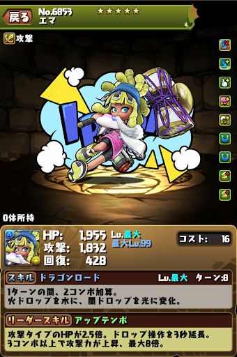 | やっ | ランダで闇ドロップを4個生成11,220ダメージ(1.5倍時:16,830ダメージ) |