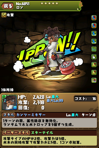 | ガムランチャー | ランダムで水ドロップを5個生成7,390ダメージ(1.5倍時:11,085ダメージ) |