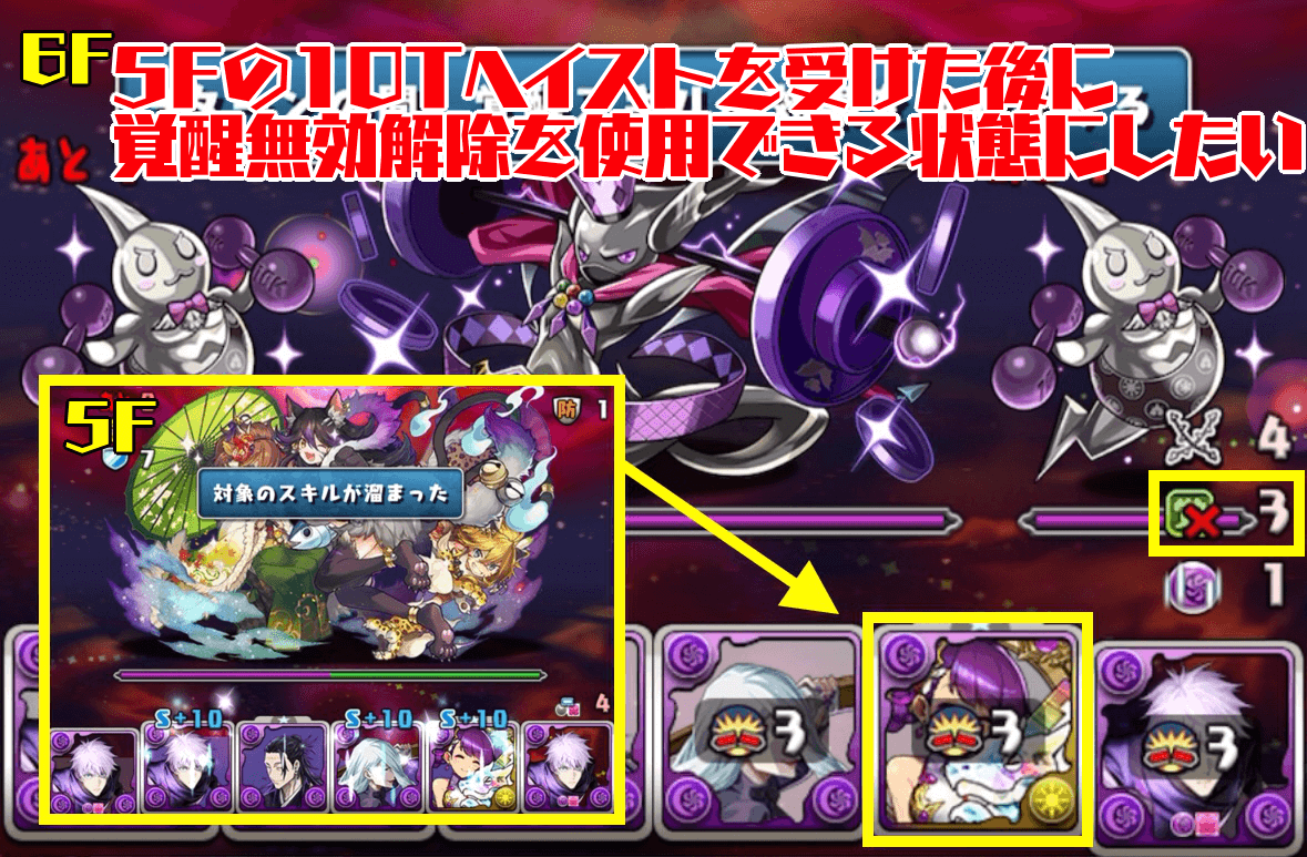 4F突破時には覚醒無効解除枠のスキルを空打ちをするべき。5F先制でサブのスキルを10ターンヘイストされ、6Fで覚醒無効を受けるため空打ちしないとアシストスキルが溜まってしまうことがあるためだ。