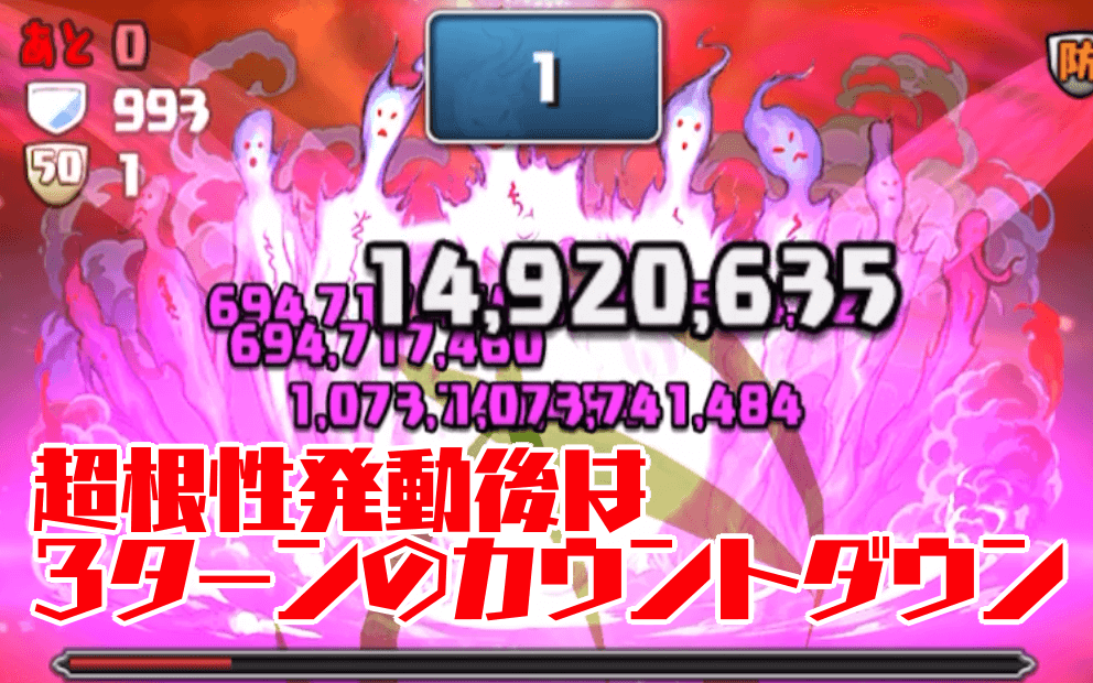 【特徴】 ・超根性(75%) ・HP820億 【先制】 ・状態異常無効(7ターン) ・3マスルーレット(4ターン) ・操作時間激減(2ターン)【超根性発動時】 ・15億以上無効(6ターン) ・全員ダメージ上限20億(3ターン) ・2,400,000ダメージ ・全ドロップを光に変化 |