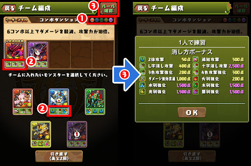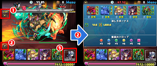チームが編成できたらいよいよバトル開始だ。ダンジョン毎に設定された消し方ボーナスや、編成したモンスターのスキルを駆使しより高得点を獲得しよう。