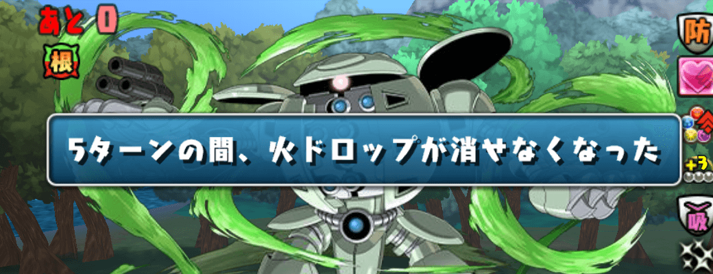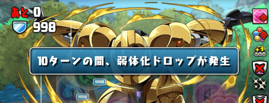 3Fの超根性発動時に30%の弱体化ドロップ目覚めを発動される。パーティ全体で各色のドロップ強化を40%以上にしていればギミック効果を受けずに突破できるためおすすめの対処法だ。