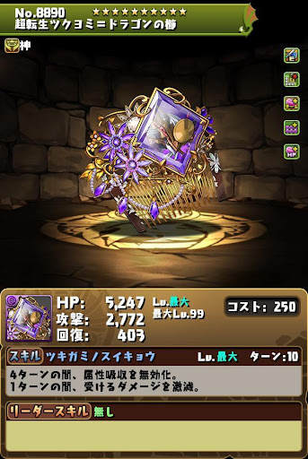 | 癒しの月光真・ツキガミノカイナ混沌の月光消失の息吹 | HPが20%回復147,470ダメージ 全ドロップを火と光と闇に変化2マスルーレット(1ターン)闇消せなくなる(2ターン) |