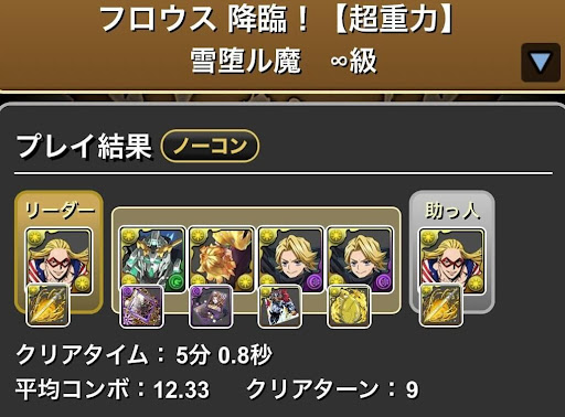 | 5F | 【特徴】 ・超根性(HP50%) ・HP3100億 【先制】 ・お邪魔目覚め(5ターン) ・2マスルーレット(3ターン) ・1,680,000ダメージ ・2コンボ減少(3ターン)【超根性発動時】 ・操作時間半減(2ターン) ・1,680,000ダメージ ・全ドロップを水/光/回復に変化 |