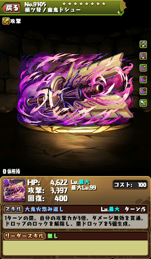 | 6F | 【特徴】 ・超根性(HP50%) ・HP350億 【先制】 ・状態異常無効(999ターン) ・火/闇属性吸収(5ターン) ・アシスト無効(3ターン)【超根性発動時】 ・1,110,720ダメージ ・左から1,3,5列目を火/2,4,6列目を闇に変化 ・1,110,720ダメージ ・4マスルーレット(3ターン) |
