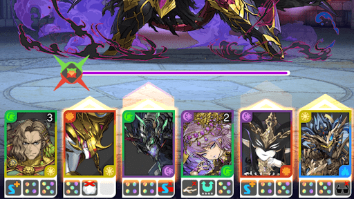 | 【5色消しチーム】5色同時攻撃で攻撃力が20倍、ダメージを50%軽減、10ダメージの追い打ち攻撃。残り操作時間2秒以上で回復力が2倍。 |
