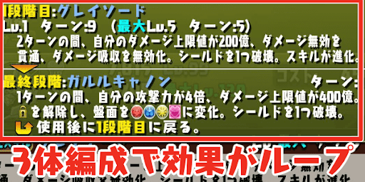 グレイソード→ガルルキャノン1段階目:2ターンの間、自分のダメージ上限値が400億、ダメージ無効を貫通、ダメージ吸収を無効化。シールドを1つ破壊。スキルが進化。(9→5)最終段階:1ターンの間、自分の攻撃力が4倍、ダメージ上限値が600億。ロックを解除し、盤面を火水光回復に変化。シールドを1つ破壊。使用後に1段階目に戻る。(1→1)