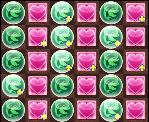 | 【「法皇」の『結界』】左から縦1列目と3列目を木に、2列目を回復ドロップに変化。右から縦1列目と3列目を回復に、2列目を木ドロップに変化。(10→10) |