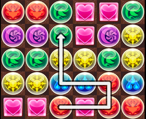 | 【エレメンタルロード】全ドロップのロックを解除し、5属性+回復に変化。5コンボ分のルートを表示(3個消し限定)(8→8) |