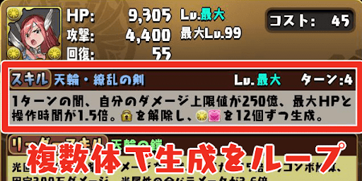 1ターンの間、自分のダメージ上限値が250億、最大HPと操作時間が1.5倍。ロックを解除し、光回復を12個ずつ生成。(4→4)【覚醒スキル】