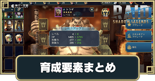 RAID:Shadow Legends(レイドシャドウレジェンド)における、育成要素について紹介。育成要素の一覧やキャラ、遺物、その他育成に関する要素をまとめて掲載しているので、RAID:SLをプレイする際の参考にどうぞ。
