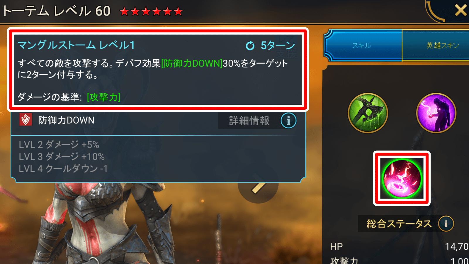 トーテムは、スキル3で全体攻撃を行い、防御力DOWN30%を2ターン付与できる。デバフの倍率こそ低いものの、属性相性さえ悪くなければ、高確率でデバフを付与できる点で優秀。