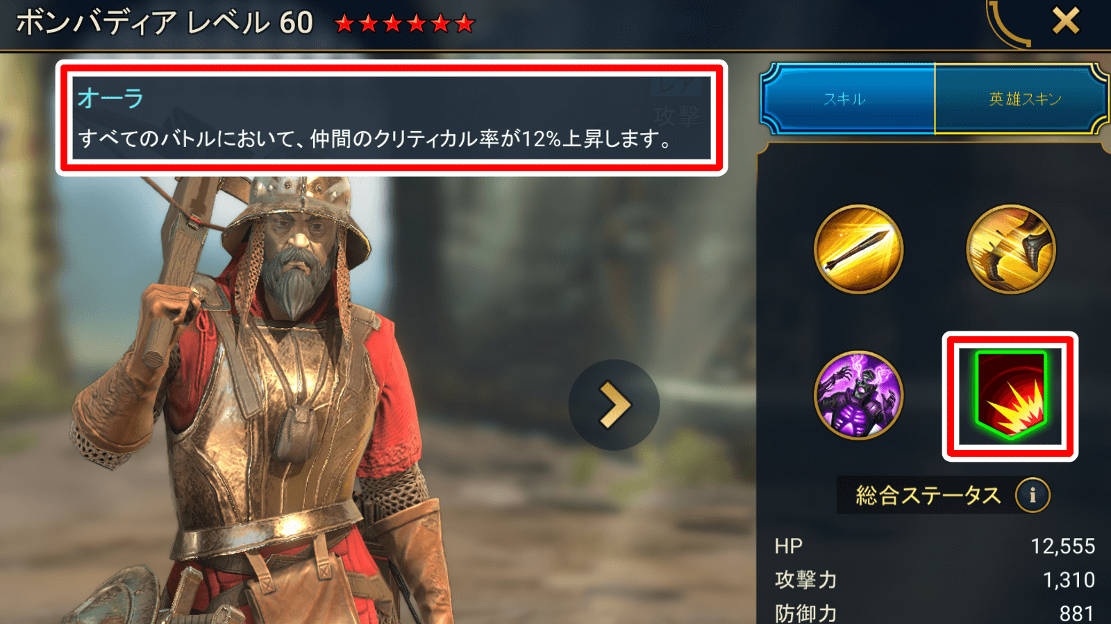 | 効果 | すべてのバトルにおいて、仲間のクリティカル率が12%上昇します。 |
