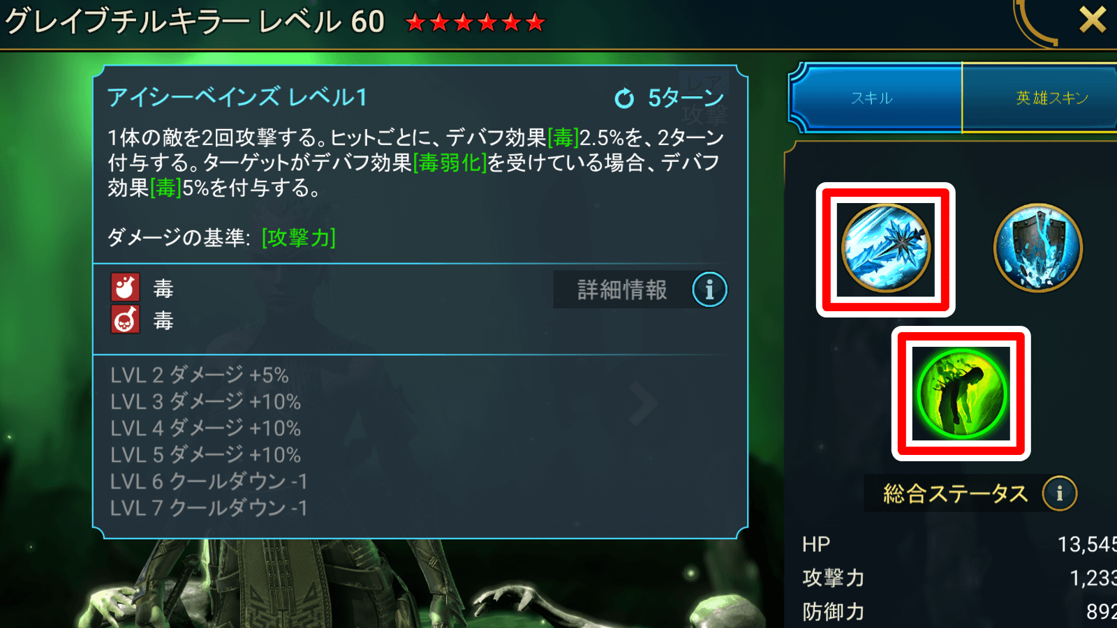 グレイブチルは、通常スキルとスキル3で毒を付与可能。スキル3の毒デバフ倍率は、ターゲットが毒弱化を受けていると2.5%から5%に強化されるため、フローズンバンシーなどの毒弱化スキルを使えるキャラと同時に編成するのがおすすめだ。