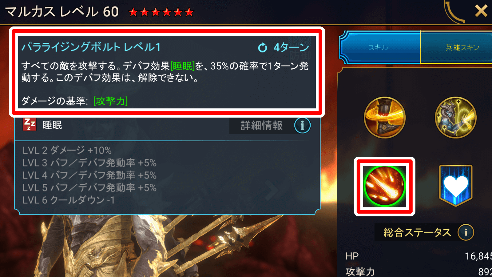 マルカスは、スキル3で全体攻撃を行い、解除できない睡眠を1ターン付与可能。味方の攻撃によって解除できない行動阻害を付与できるが、スキル上げを行ってもデバフ発動率は50%止まりであるため、安定した運用はできない。