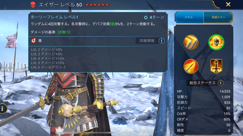 | 効果 | ランダムに4回攻撃する。各攻撃時に、デバフ効果毒5%を、2ターン発動する。 |