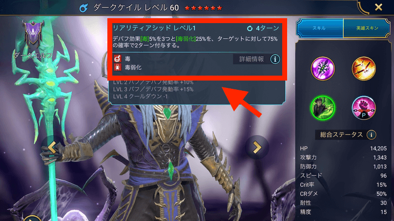 | 効果 | デバフ効果毒を2つ以上受けている敵のクリティカル率を、15%低下させる。チーム内に同スキルを持つ英雄が複数いる場合でも、効果は1つのみ発動する。 |
