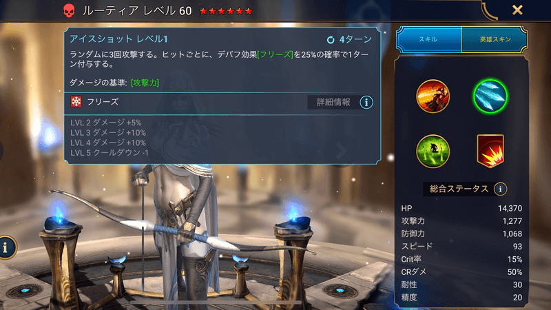 ルーティアは毒/フリーズ/スピードダウンのデバフを持ち、主に単体ボスとの戦闘に優れたアタッカーだ。最適な敵こそ少ないが、ダンジョンボス等の相手にも有効なデバフを多く持ち、行動妨害も可能なため、活躍できる場所は多い。
