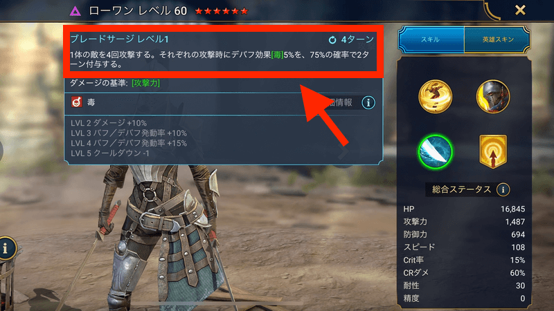 ローワンはスキル効果で毒、治癒ダウン、スタンを持ち、デバフで攻めるアタッカーだ。耐久力が低いため、補助が必須になるものの、HPの多い単体ボスに対して活躍が期待できる。