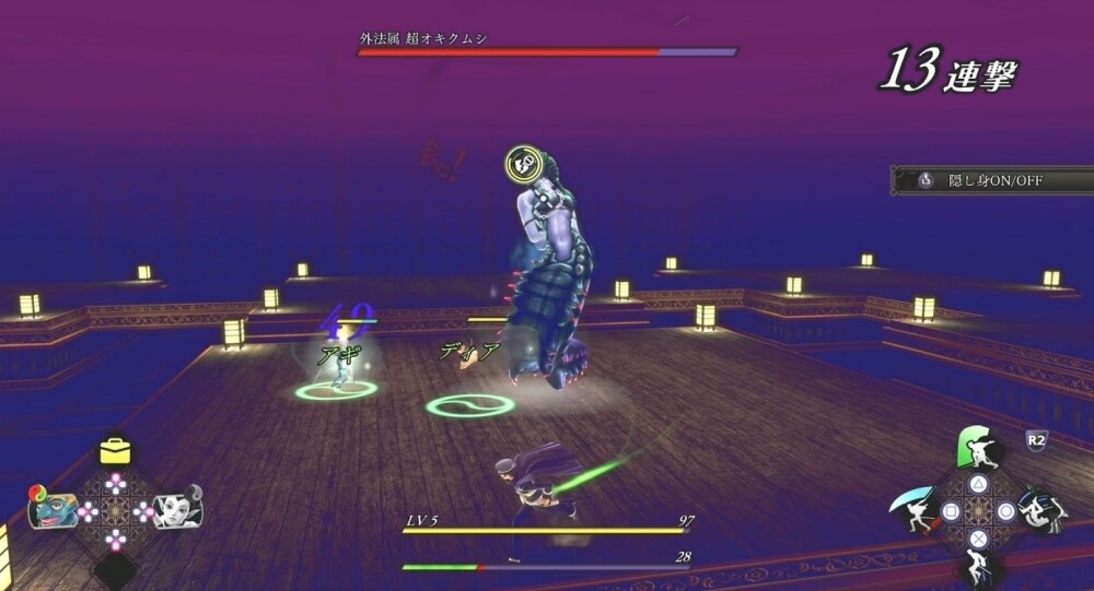 主人公は、敵の攻撃を回避することができ、隠し身で仲魔を一定時間無敵状態にできる。がむしゃらに攻撃するのではなく、敵の行動をよく見て回避を成功させると、被弾が減らせて戦闘を優位に進められる。