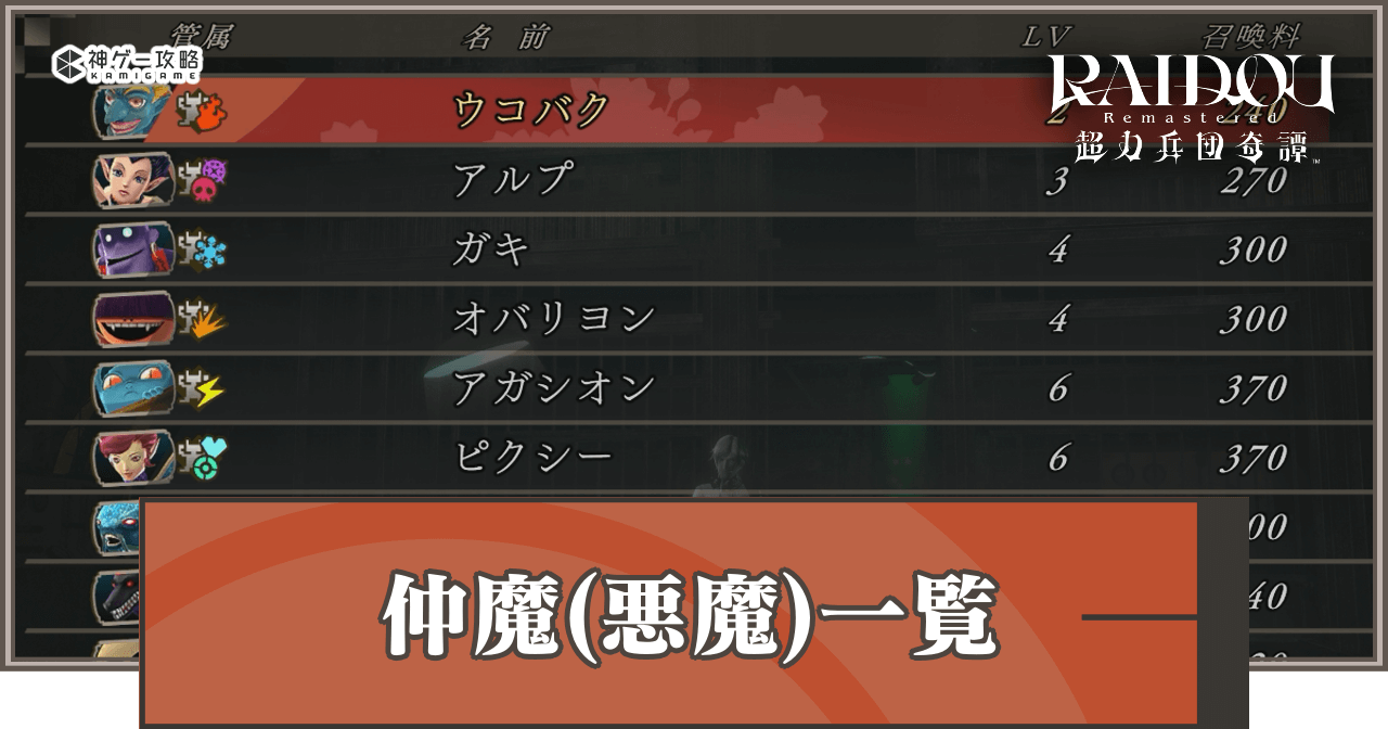 ライドウリマスターの「悪魔(仲魔)一覧」を解説。ライドウの仲間の出現場所や合体例、業魔殿についても掲載しています。
