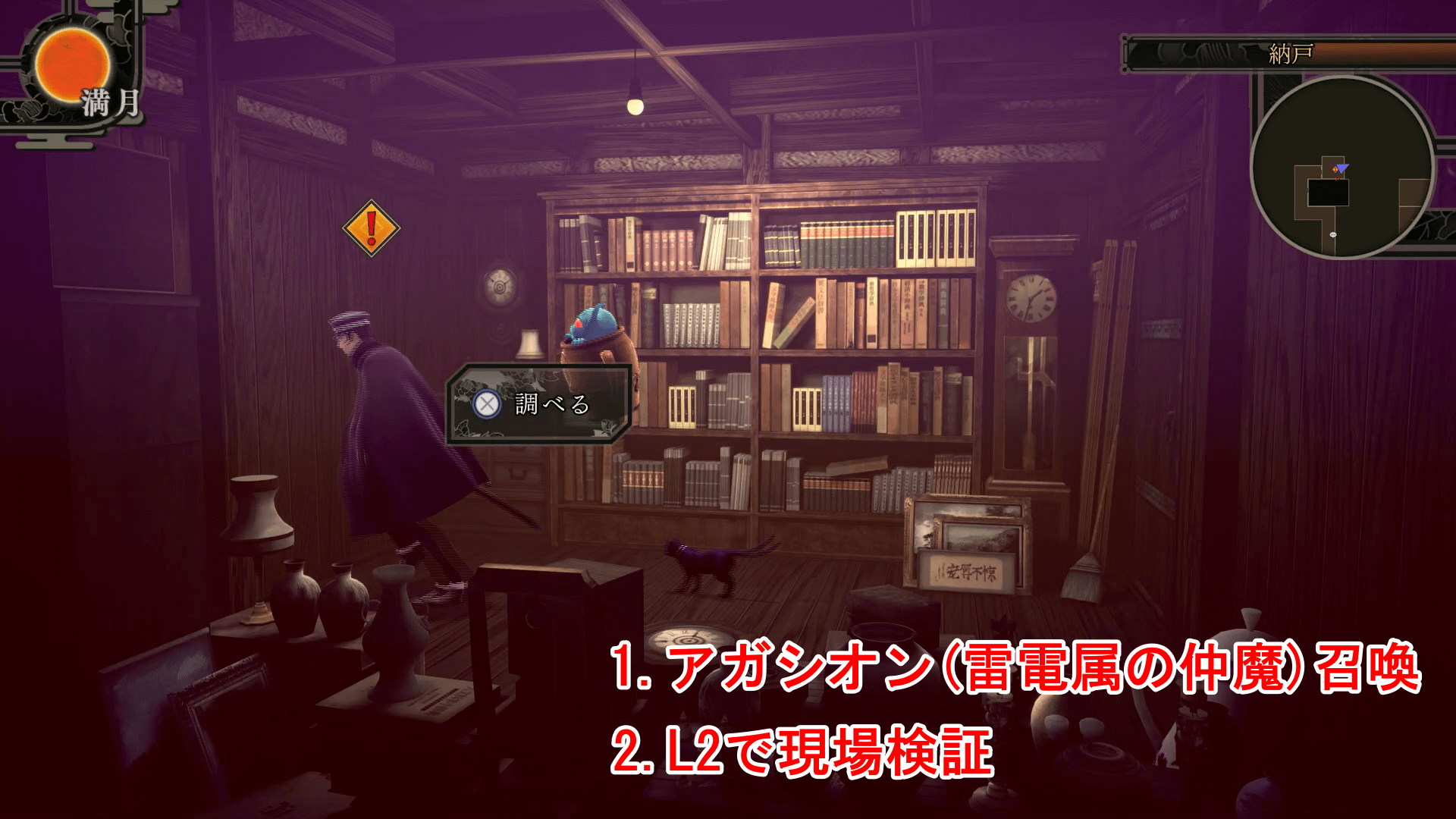 納戸で現場検証する際は、異界・筑土町で仲魔にしたアガシオンを使うと良い。なお、現場検証は雷電属の仲魔を召喚した状態でしか行えないため、必ずアガシオンに切り替えておこう。