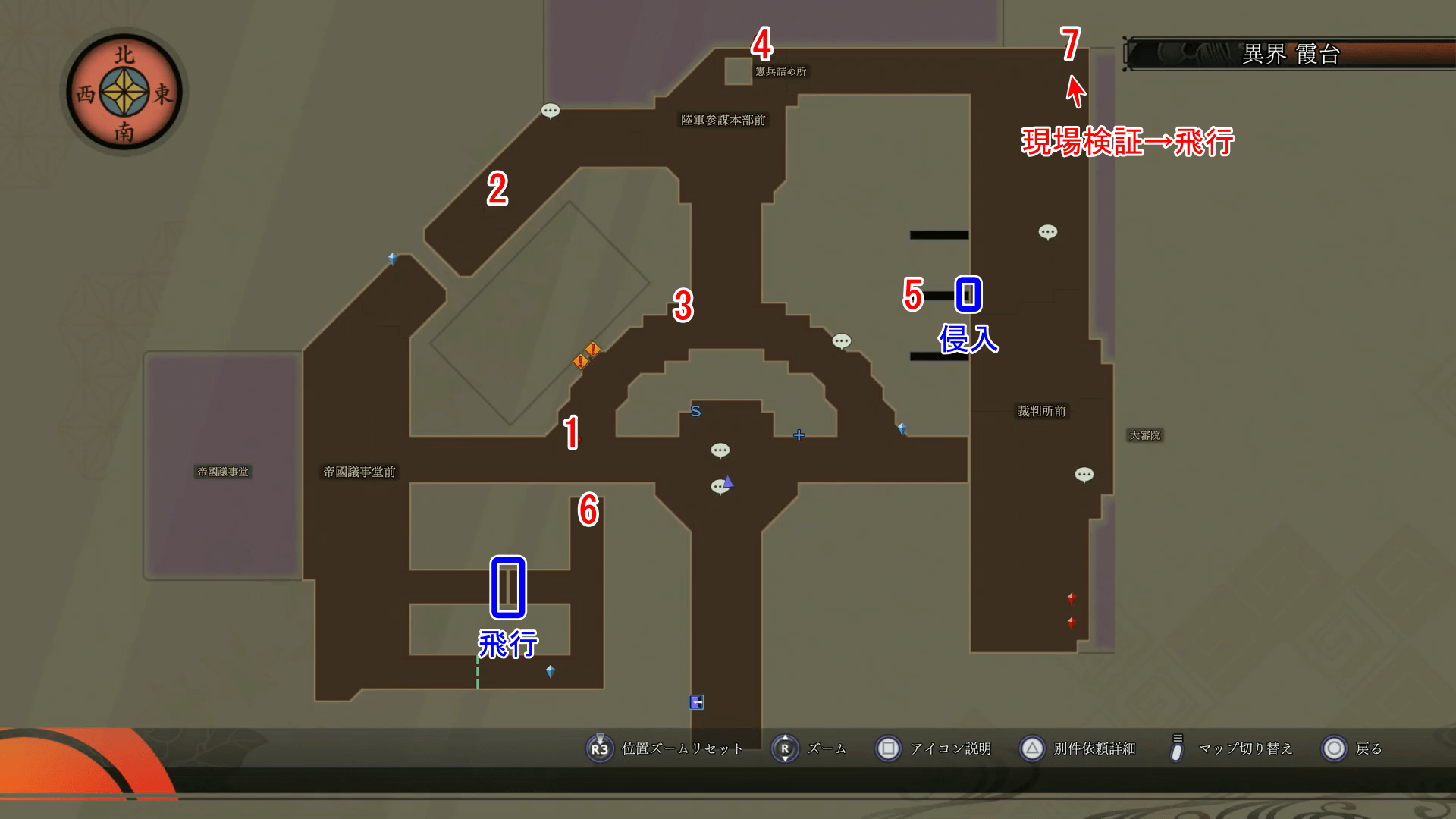 報告書1~5は、マップ上の位置で現場検証を行えば回収できる。報告書5は侵入、報告書6は飛行、報告書7は現場検証した後に飛行を使って回収しよう。