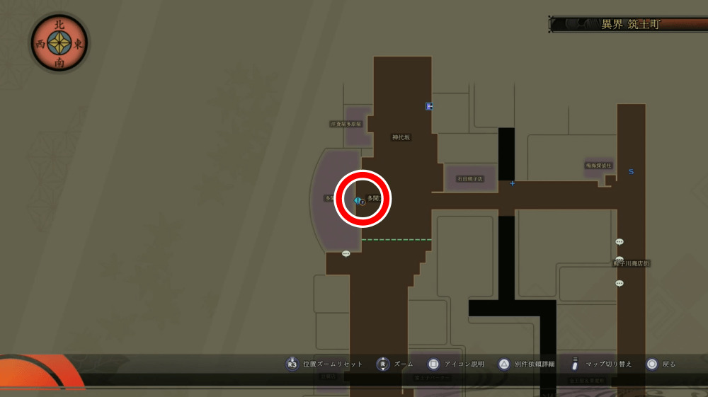マップ 外観 「特訓だ」が発生したら、現場急行で異界の筑土町に向かおう。異界筑土町龍穴B前から多聞天に行くと、そのまま「特訓だ」が始まる。現実の多聞天に行っても別件依頼は始まらないので、必ず異界に向かおう。