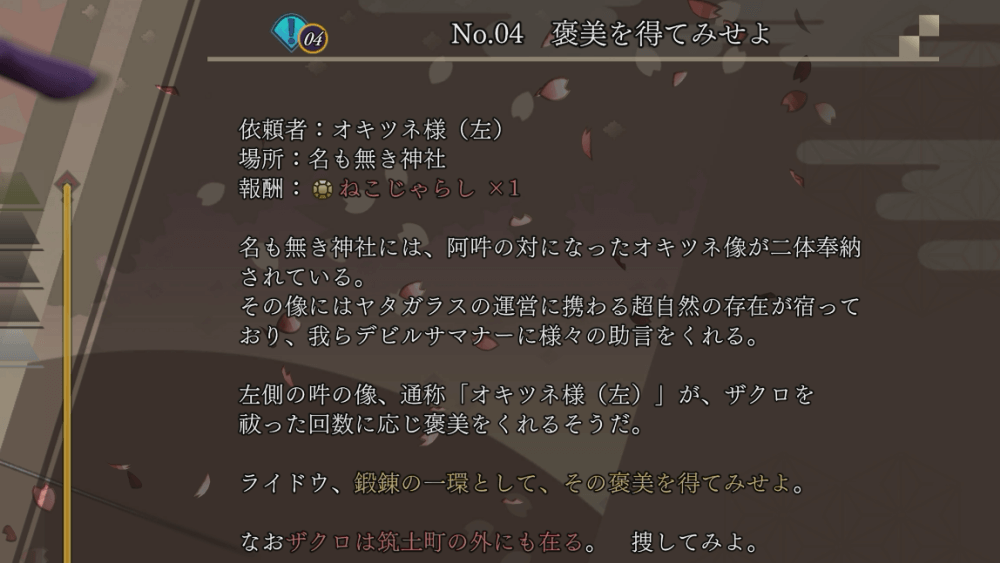 ザクロを5か所祓って報酬を貰うと同時に、別件依頼「No.4 褒美を得てみせよ」も達成できる。達成報酬として、ねこじゃらしを受け取れる。