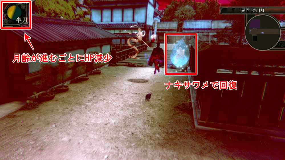 異界深川町の探索中、主人公は斑駒状態となり、章をクリアするまで移動でダメージを受け続ける。月齢が進むごとにHPが1/10ずつ削られ、満月時には残りHPの半分を削り取られてしまう。探索中はスタート地点近くの「ナキサワメ」を利用して、こまめに回復を行おう。