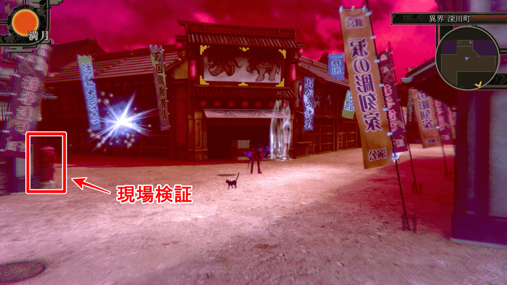 悪魔兄弟の罠に2回引っかかったら、見世物小屋付近のポストに特技「現場検証」を使おう。ポスト裏の光る場所を調べると、貼ってある御札を破って悪魔兄弟との戦闘になる。