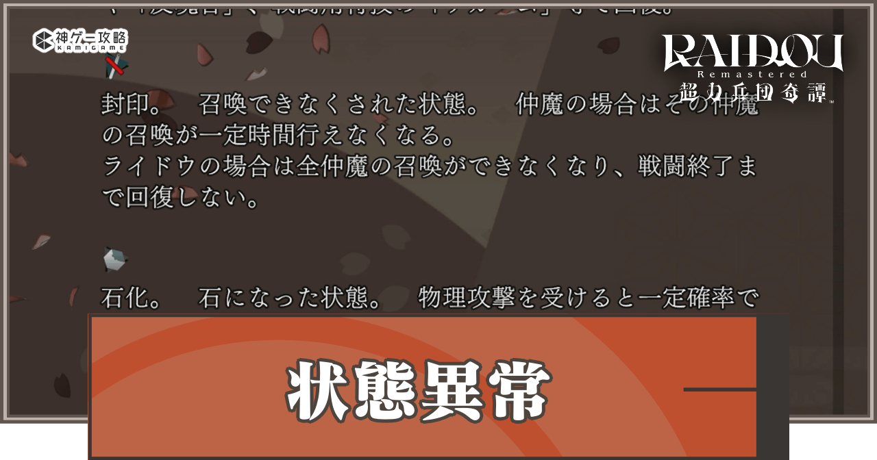 ライドウリマスターの「状態異常」について紹介。状態異常の対処方法や治し方に加え、効果を一覧で掲載しています。