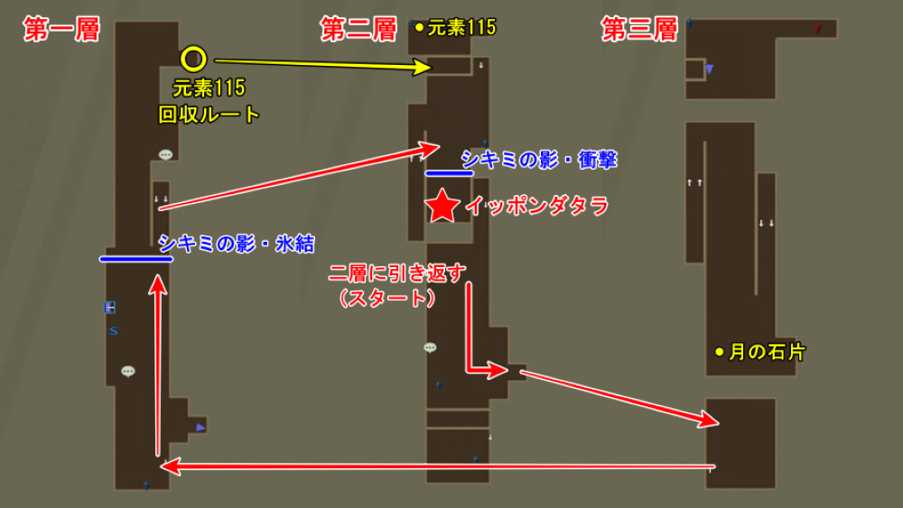 | 1 | 第一層の南から飛び降り、右に降りて第二層へ |