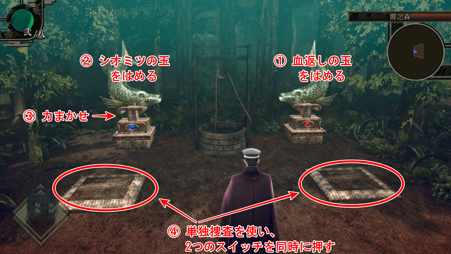 上の画像を参考に、井戸前にある2体の像のギミックを解き、造船所の隠し通路を開こう。ギミック解除には捜査用特技「力まかせ」が必要なので、事前に蛮力属の仲魔を用意しておくと良い。