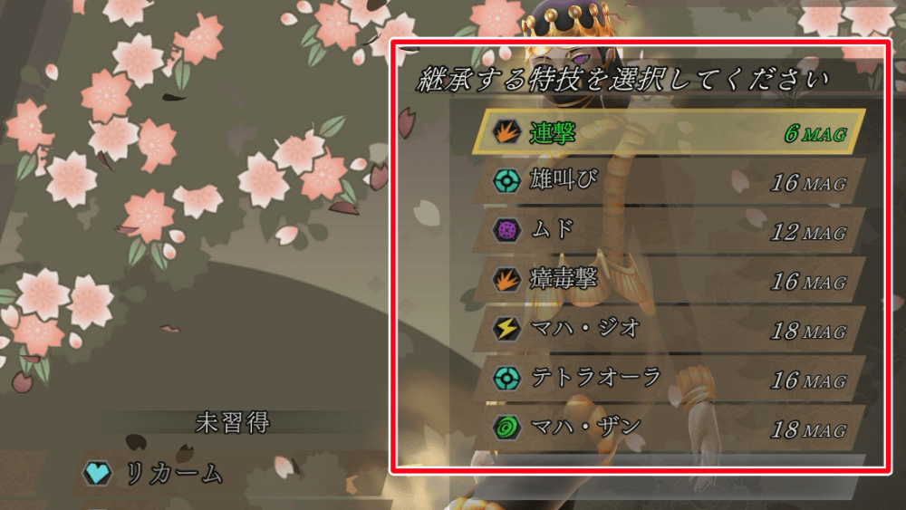 継承するスキルが選べたら、合体を行おう。合体に成功したら、合体元となった仲魔の思い出特技の中から継承したい物を選べば、悪魔合体は完了となる。