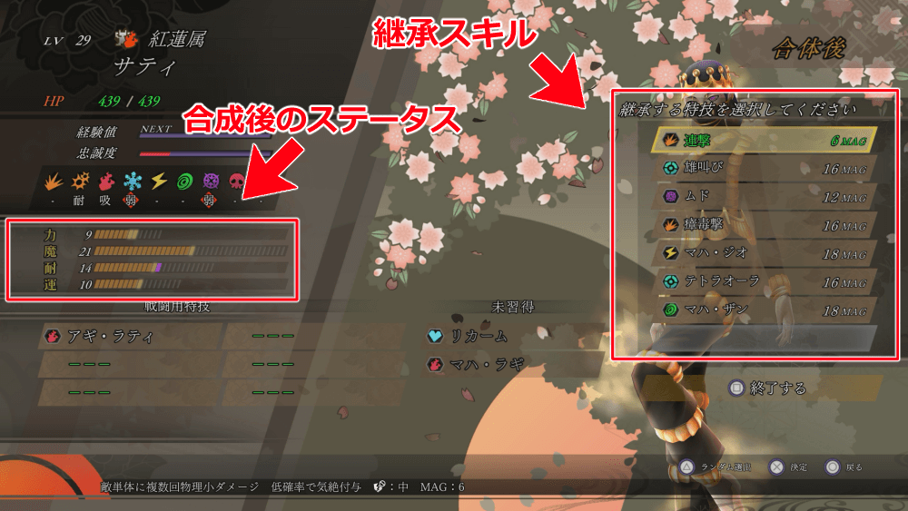 合体に必要な仲魔を選んだら、合体後に作れる仲魔のステータスや継承できるスキルを確認しよう。なるべく、レベルアップで習得できない属性の特技を習得させるのがおすすめだ。