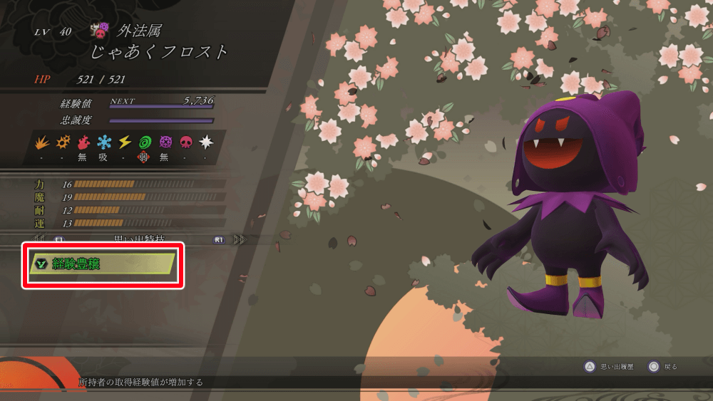 | 経験豊穣の効果と習得する仲魔 |