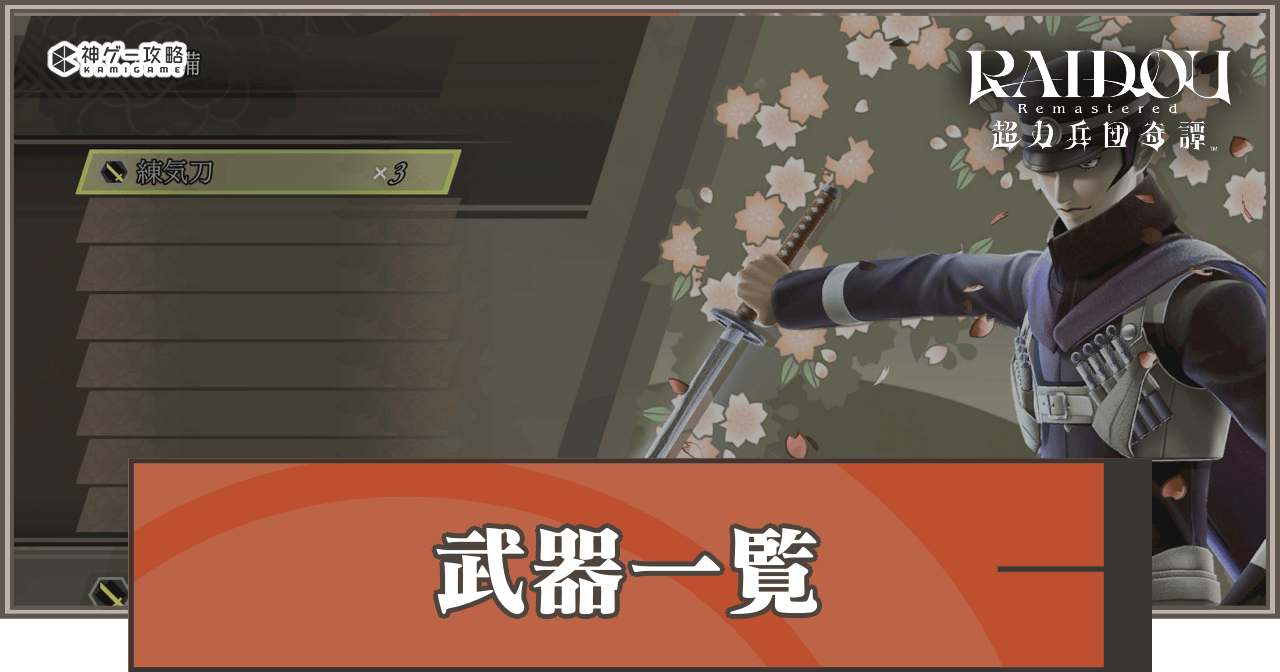 【ライドウリマスター】武器一覧 編集者 ライドウリマスター攻略班 最終更新日 2025/06/24 15:00 ライドウリマスターの「武器一覧」を解説。ライドウの武器性能や必要素材についても掲載しています。 目次 武器一覧 武器一覧 練気刀10000100素材なし備前長船15000101素材紅蓮魔鋼×2、銀氷魔鋼×1、練気刀×1特技【虚空斬波】(物理)周囲に範囲中の物理ダメージ銘刀虎徹18000201素材紅蓮幻銅×1、銀氷魔鋼×2、備前長船×1特技【封魔のアダージョ】封魔術を失敗しにくくする妖刀村正21000202素材紅蓮幻銅×2、銀氷幻銅×2、銘刀虎徹×1特技【撞球遊戯】(物理)直線範囲の物理中ダメージ、対象に向かって3回直進する無想正宗24000203素材紅蓮幻銅×2、銀氷幻銅×1、紅蓮魔鋼×2、妖刀村正×1特技【生体MAG抜き】強刀の連続攻撃の最後の一撃と、強刀溜め攻撃でMAGが回復するようになる吼刀薄緑25500302素材銀氷幻銅×2、銀氷魔鋼×3、プラスチック×1、妖刀村正×1特技【耐精呪】精神・呪殺属性のダメージが半減する陽剣干将27000304素材紅蓮霊銀×1、紅蓮幻銅×2、紅蓮魔鋼×3、無想正宗×1特技【十全なる悪魔使役】(属性無効)味方全体が20秒間、火炎、氷結、電撃、衝撃、呪殺、精神無効陰剣莫耶30000504素材銀氷霊銀×2、紅蓮幻銅×3、元素115×1、吼刀薄緑×1特技【鬼面抜打】(物理)前方扇状に範囲特大の複数回物理中ダメージ草薙の剣30000405素材紅蓮霊銀×2、銀氷霊銀×3、銀氷幻銅×2、陽剣干将×1特技【耐火電】火炎・電撃属性のダメージが半減する鬼切の太刀30000504素材紅蓮霊銀×3、外法霊銀×2、月の石片×1、陽剣干将×1特技【医術の心得】戦闘勝利後、自身のHPを一定量回復する倶利伽羅の剣33000506素材外法神金×1、外法霊銀×2、外法幻銅×3、月の石片×1、草薙の剣×1特技【即殺】ライドウの戦闘用特技が再び使用できるまでの時間を僅かに短縮輝煌星剣33000605素材銀氷神金×2、銀氷霊銀×3、銀氷幻銅×3、銀氷魔鋼×4、鬼切の太刀×1特技【報復の狼煙】死亡を一度だけ防ぎ、HP半分で復活する天叢雲36000607素材紅蓮神金×1、外法神金×2、銀氷霊銀×3、紅蓮魔鋼×2、倶利伽羅の剣×1特技【退魔一族の気迫】スピリット剣の威力が上昇秘剣ヒノカグツチ36000706素材紅蓮神金×3、銀氷神金×2、外法神金×2、ホムスビの首×1、輝煌星剣×1特技【陰陽転生】受けたダメージの20%MAGが回復するようになる姫鶴一文字15000011素材疾風魔鋼×2、技芸魔鋼×1、練気刀×1特技【降伏弾】(銃撃)敵単体に銃撃大ダメージ関兼定18000111素材疾風幻銅×1、技芸魔鋼×2、姫鶴一文字×1特技【鳳の足】回避性能が向上、「玄の足」と重複できる小烏丸21000121素材疾風幻銅×2、技芸幻銅×2、関兼定×1特技【ヒートウェイブ】(物理)前方に飛距離無限の斬撃を放ち物理特大ダメージ小狐丸影24000131素材技芸幻銅×2、外法幻銅×2、プラスチック×1、小烏丸×1特技【次元超え】銃撃の照準固定が高速になる小狐丸24000221素材疾風幻銅×1、技芸幻銅×2、技芸魔鋼×2、小烏丸×1特技【ハッピーアタッカー】連撃数が25以上でMAG回復量が上昇プラズマソード27000232素材疾風霊銀×1、疾風幻銅×4、元素115×1、小狐丸影×1特技【マグナム弾】(補助)ライドウの銃が一定時間無制限に射撃可能、威力も上昇天破雷切27000322素材技芸霊銀×1、疾風幻銅×2、技芸魔鋼×2、小狐丸×1特技【メギドラオン】(万能)周囲に範囲特大の万能特大ダメージルナブレード30000342素材疾風霊銀×2、技芸霊銀×3、月の石片×1、プラズマソード×1特技【耐氷衝】氷結・衝撃属性のダメージが半減するソルブレード30000432素材疾風霊銀×3、技芸霊銀×2、技芸幻銅×2、天破雷切×1特技【玄の足】回避性能が向上、「鳳の足」と重複できるトリシュウラ33001343素材疾風神金×2、疾風霊銀×3、疾風幻銅×3、疾風魔鋼×4、ルナブレード×1特技【金星の加護】敵を弱点硬直させるとMAGが一定量回復布都御霊33001433素材疾風神金×1、技芸神金×1、疾風霊銀×3、ソルブレード×1特技【閃きのすゝめ】回避・かごめ舞で、殺魔一閃の閃きを発生しやすくなるゲイボルグ34002542素材技芸霊銀×3、外法霊銀×3、元素115×1、月の石片×1、天破雷切×1特技【たてやぶり】味方の攻撃で弱点シールドに与えるダメージが大幅増加霧氷月影36002353素材疾風神金×4、技芸神金×2、外法霊銀×3、太陰の勾玉×1、トリシュウラ×1特技【英雄の貫禄】ライドウのHPが最大の間、刀攻撃の威力増加ロンギヌス36002533素材勝利の冠×1、争乱の御剣×1、飢餓の天秤×1、死病の刻印×1、布都御霊×1特技【大殺魔一閃】殺魔一閃の威力が上昇三十二年式軍刀15002000素材蛮力魔鋼×2、雷電魔鋼×1、練気刀×1特技【マグネタイズ】(回復)MAGを最大値の50%分回復大般若長光18003000素材蛮力幻銅×1、雷電魔鋼×2、三十二年式軍刀×1特技【虎の型】防御で受けるダメージが減少、「竜の型」と重複できる仁王清綱210103000素材蛮力幻銅×2、雷電幻銅×1、大般若長光×1特技【興奮】(興奮)味方全体の状態異常を回復し、10秒間興奮状態にする剛刀長道240203000素材蛮力幻銅×2、雷電幻銅×2、外法魔鋼×2、仁王清綱×1特技【うしろのしょうめん】