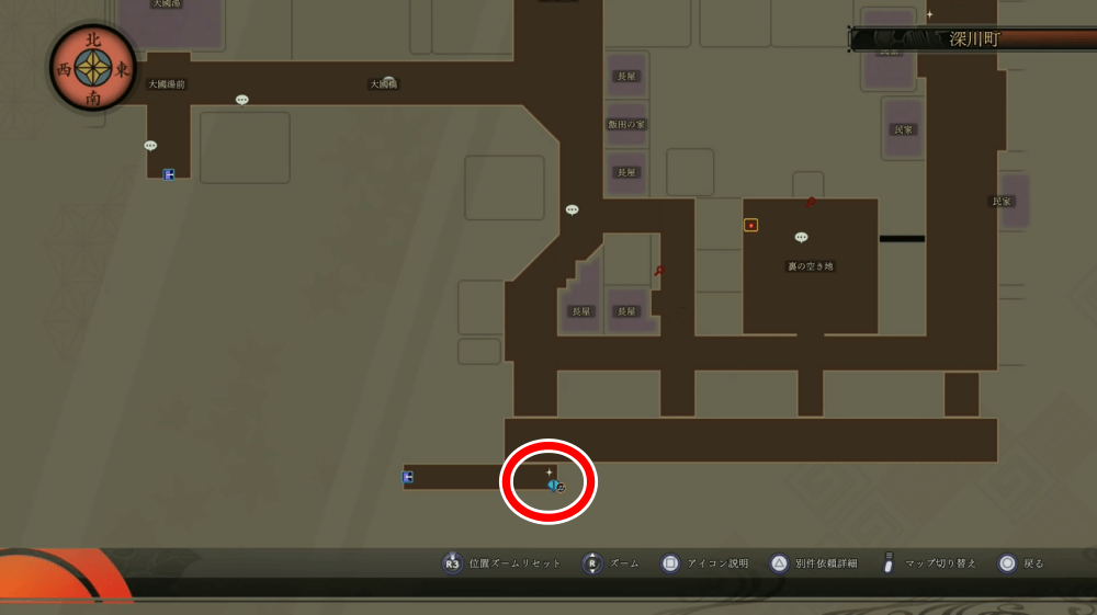 「覗き魔を許すな」は、第4話「港街連続失踪事件」を進行すると受注できる。クエストが発生したら、深川町の川向うへ行こう。