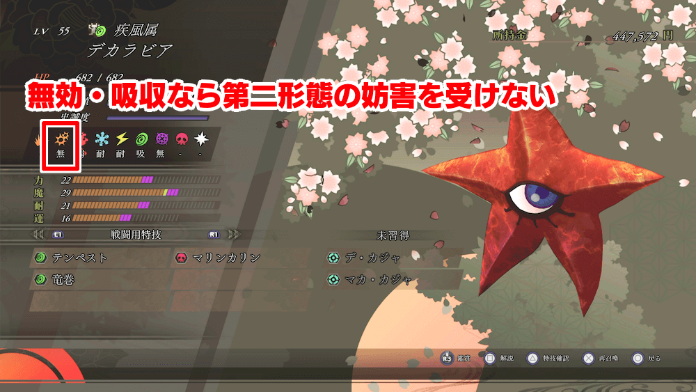 ラスボス戦に特化した仲魔を用意するなら、銃撃無効以上の仲魔を揃えよう。レベル50〜60の間では「デカラビア」や「クダン」が対象となり、どちらも魔法アタッカーとして扱いやすい性能を持つ。合体時に属性魔法と属性高揚を揃え、火力を伸ばしておくと良い。