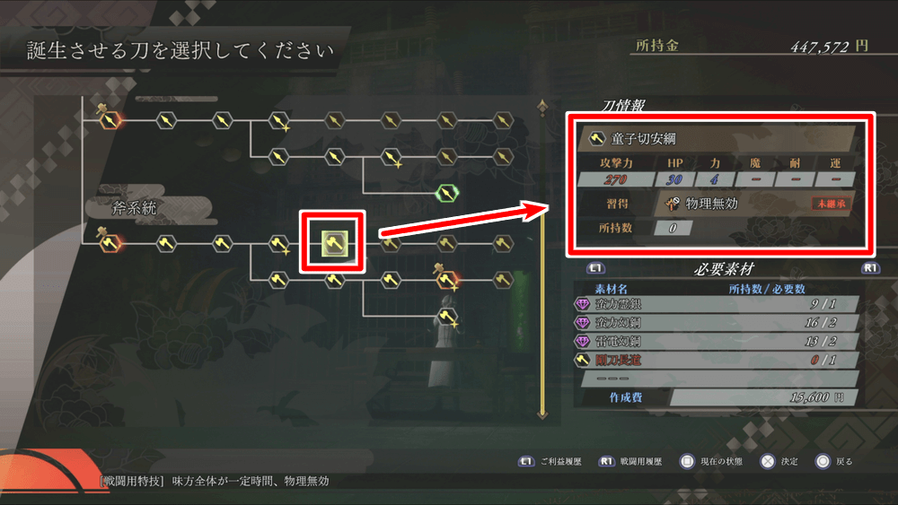 第一形態の攻撃は大半が物理属性のため、斧系統の童子切安綱で習得する「物理無効」が極めて効果的だ。発動後20秒間はダメージを気にせず攻め込めるため、他の技のリチャージ待ちとしても活躍する。倒せず苦労している場合は、武器を用意してから再挑戦しよう。