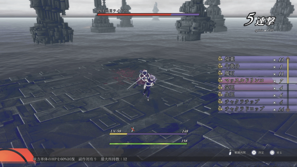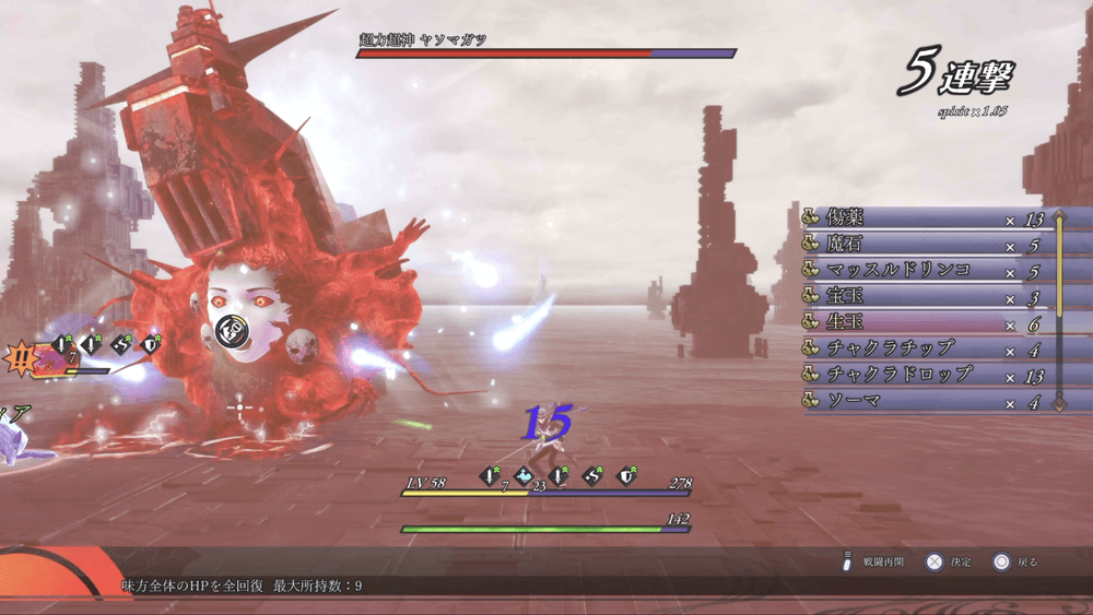 第四形態を超えればゲームクリアとなり、アイテムは2周目に引き継げないため、残っているアイテムは全て使い切る勢いで良い。MAGもチャクラドロップで回復し、ガンガン特技を使わせよう。
