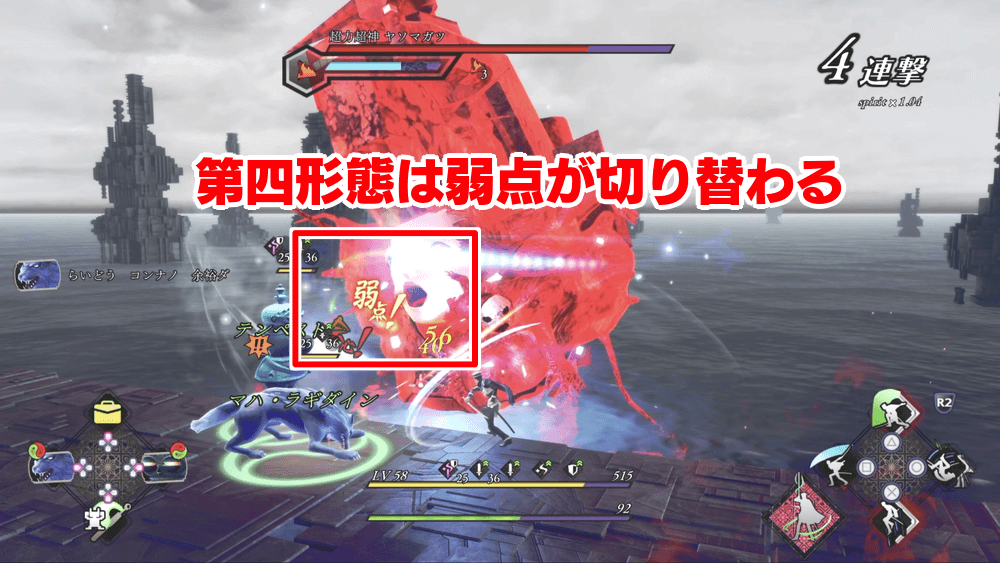 固定された弱点は第二形態の雑魚敵だけだが、第四形態がタイミングによって異なる弱点を発生させるため、4属性全てを使える仲魔を用意しておくと良い。最終話自体が各属性を必要とする機会が多いため、耐性含めて万能な仲魔を用意して進めるのがおすすめだ。