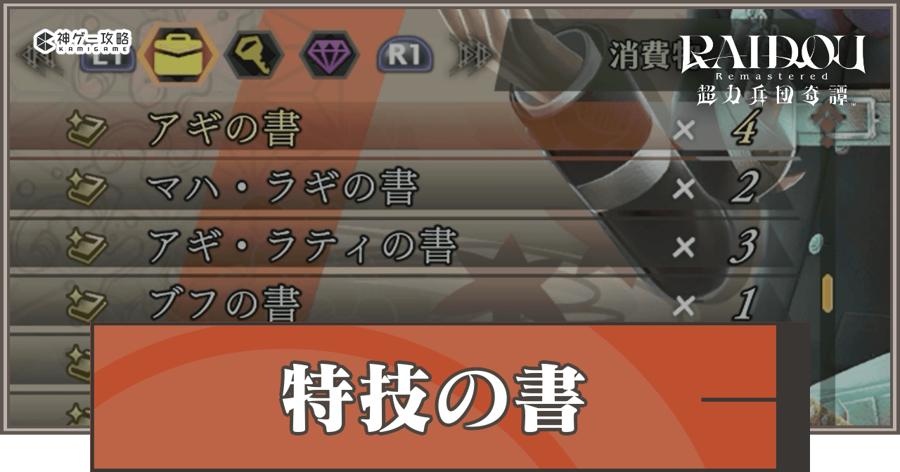 ライドウリマスターの「特技の書」を解説。特技の書の入手方法や集め方、効果と使い道についても掲載しています。