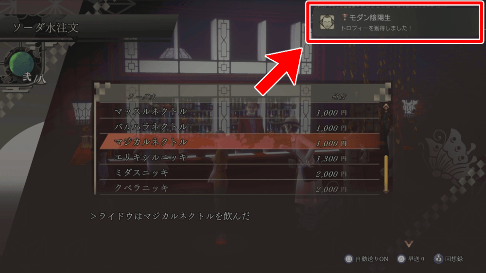 ミルクホールの商品をたくさん買うと、トロフィー「モダン陰陽生」を入手できる。お金が4万弱必要になるので、お金を貯めてからミルクホールでソーダ水を大量購入しよう。