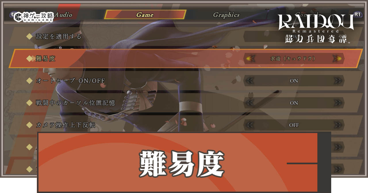 アクションとストーリーのバランスを考えるなら、「正道(セイドウ)」の難易度がおすすめだ。難易度が高いほど被ダメージが増加するので、プレイしていて難しいと感じたら「王道(オウドウ)」以下に下げる、簡単だと感じたら「求道(キュウドウ)」以上に上げて調整しよう。